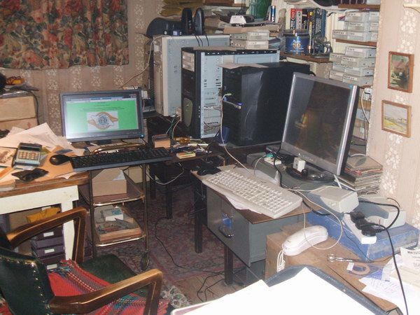 This is not actually part of the workshop since it is in an upstairs room. There are now five computers in all in the network ranging from an early Windows 98SE to a new Windows 7 which has its own keyboard and screen (on the left). The other keyboard and screen looks after the other four and is switched to each one as required. The separate Windows 7 screen is proving to be very convenient.