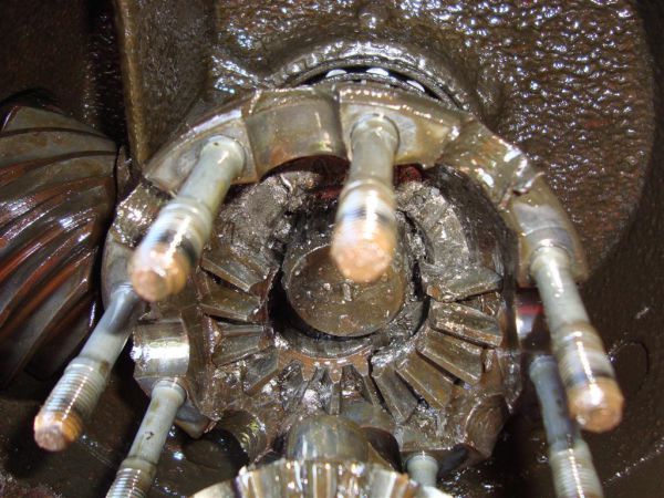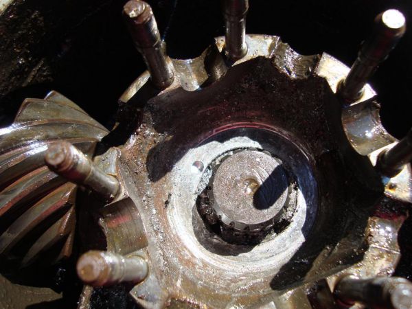 All of the bearings were in fine condition, the r/h halfshaft was jammed into the diff box by the fragmented drum of the driving bevel, necessitating the cutting off of the r/h half.