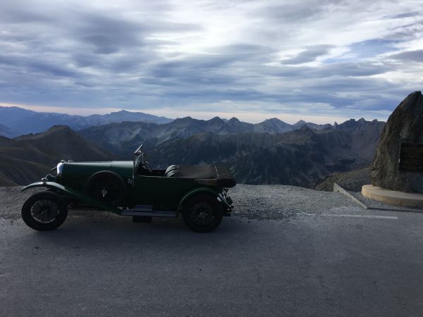 What a lovely view of the car set against the mountain peaks!