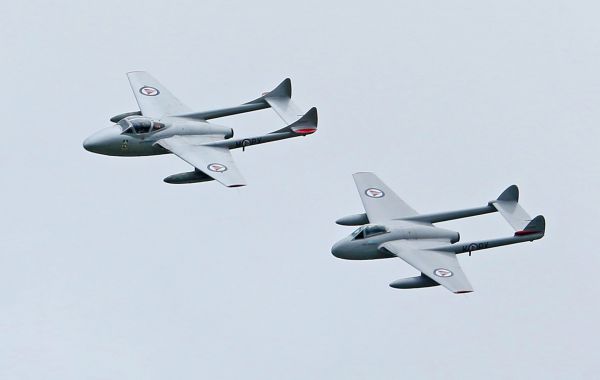 As 50% of TV these days is either about vampires or zombies, these flew over my plot last Friday, against a clear blue sky with the Frank Halford designed Goblin turbo jets whistling nicely.