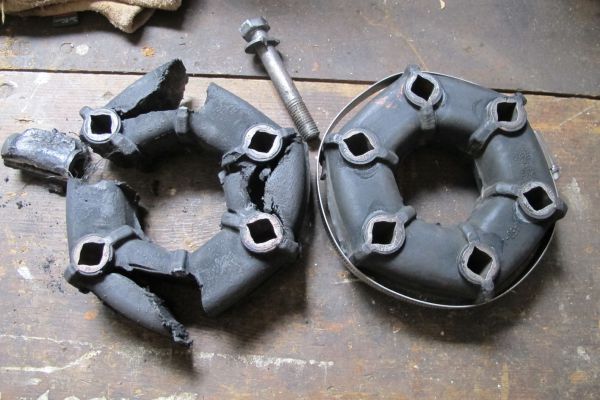 Paul - These pictures show the Ford Granada doughnut in place, the one that was breaking up but, amazingly, still providing drive, and a new one complete with clamping band. The band has to be kept in place until the doughnut is bolted into the drive line, otherwise the bolt holes won't line up.